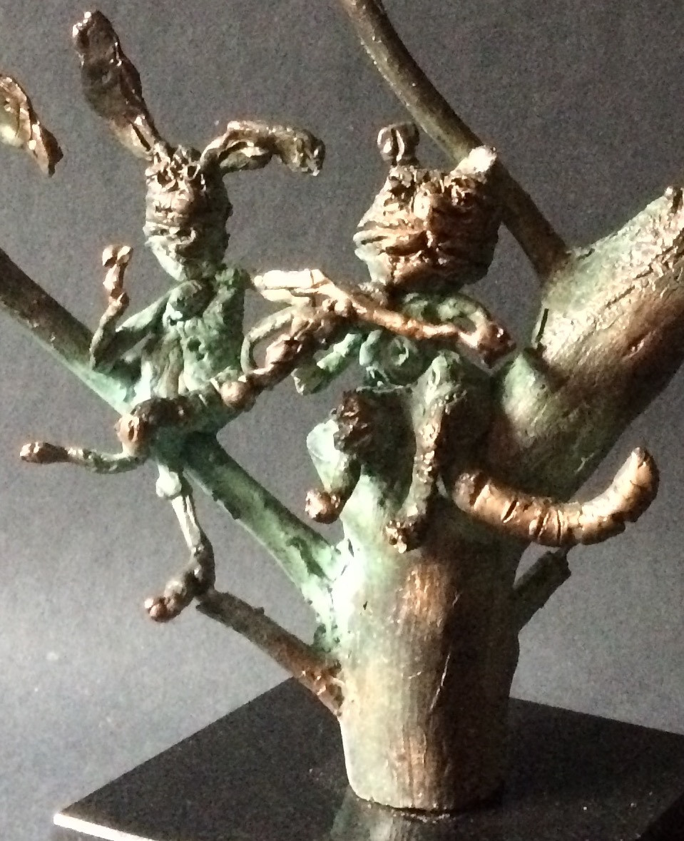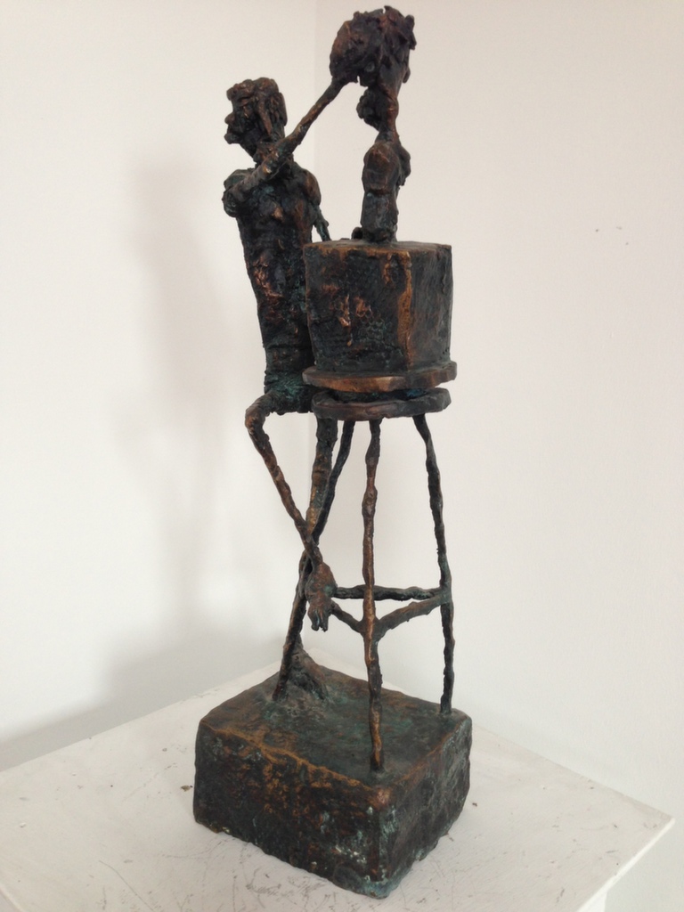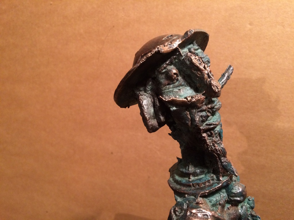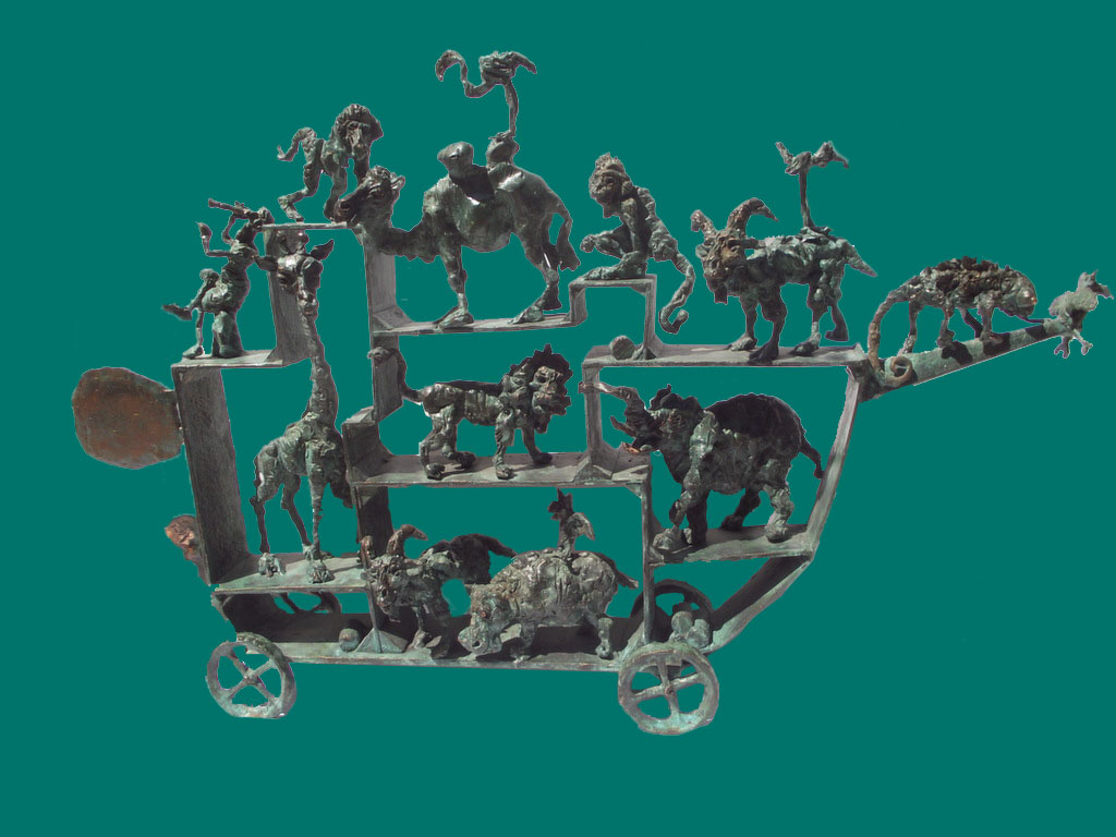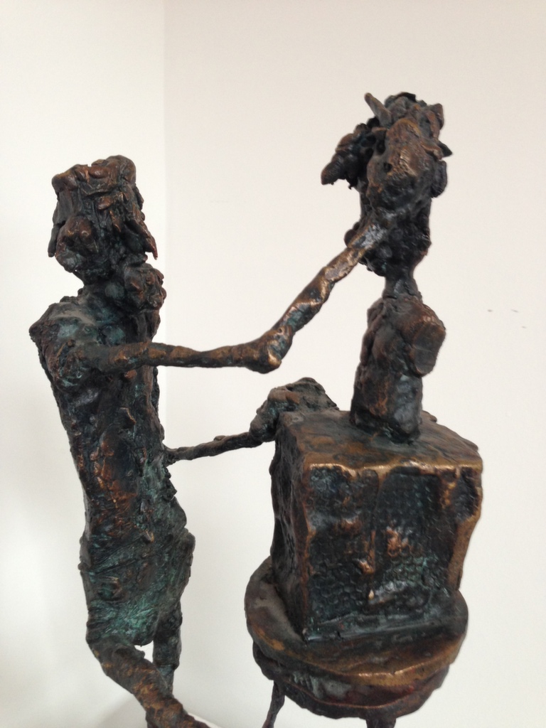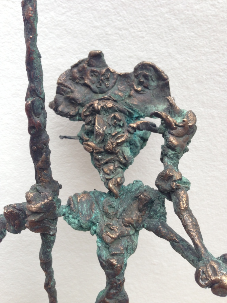 The caricature figures guard their seriousness and sublimity with fine simplicity. They are the players in the whirling fictive drama, which is brought to life by the bronze sculptures. The various, odd forms, devoid of all conformity, are rich and inventively shot through with contour effects, the scabrous surfaces inducing sculptures saturated with anxiety, tension and excitement.