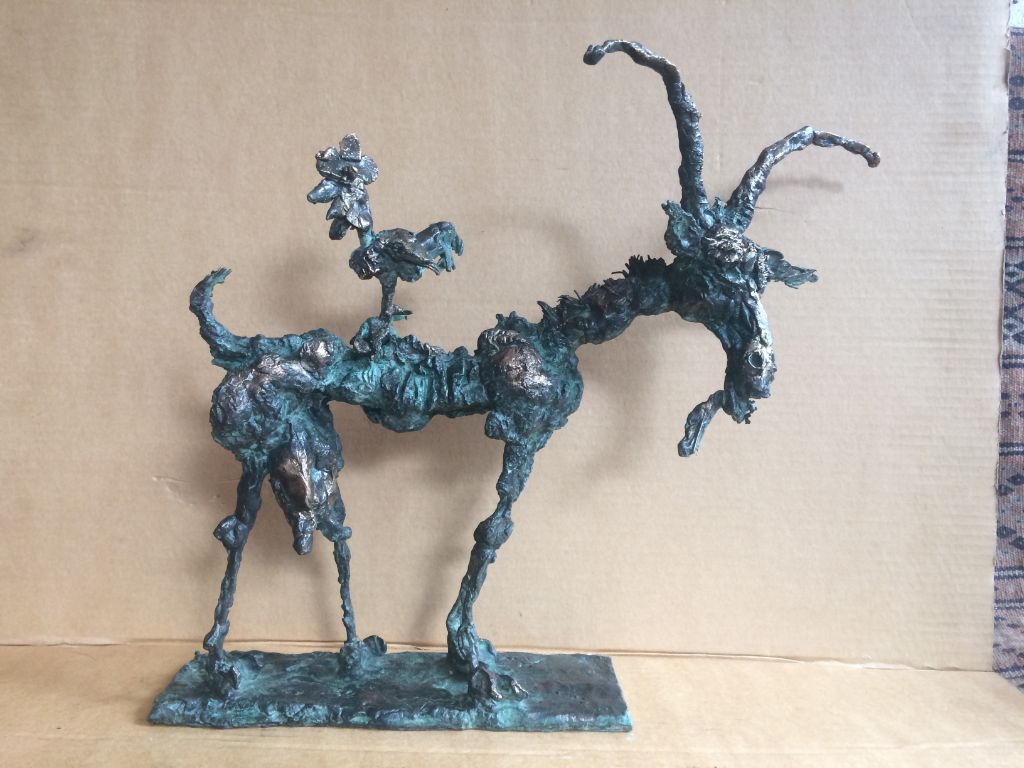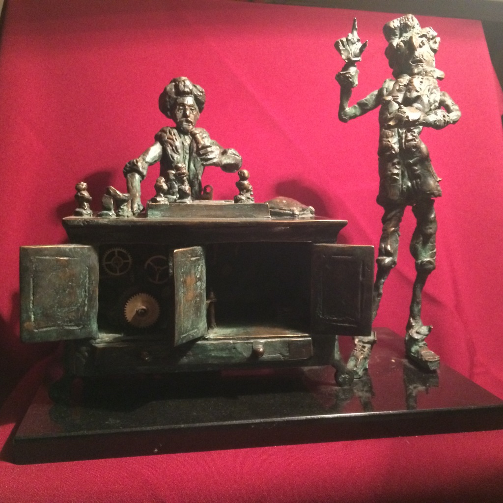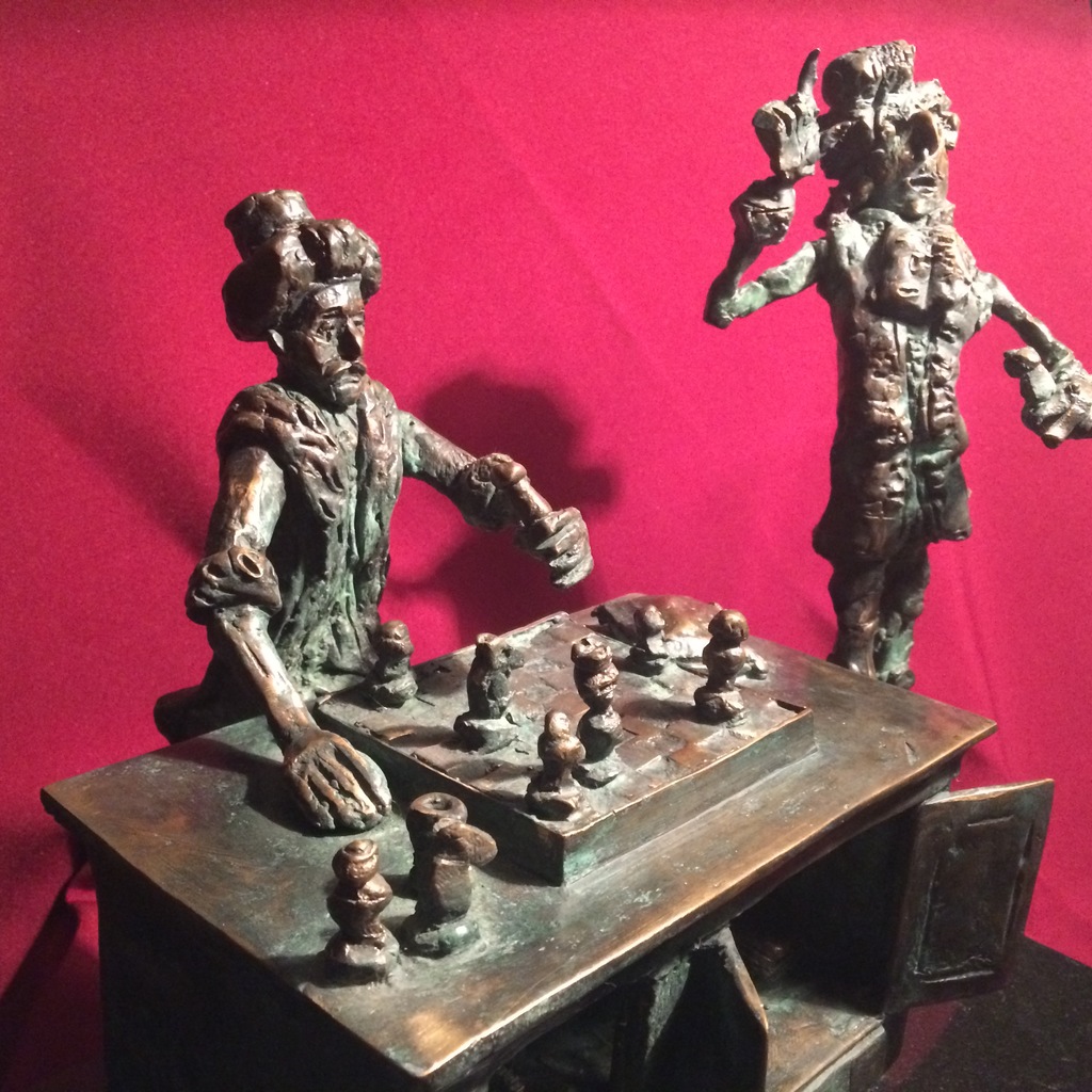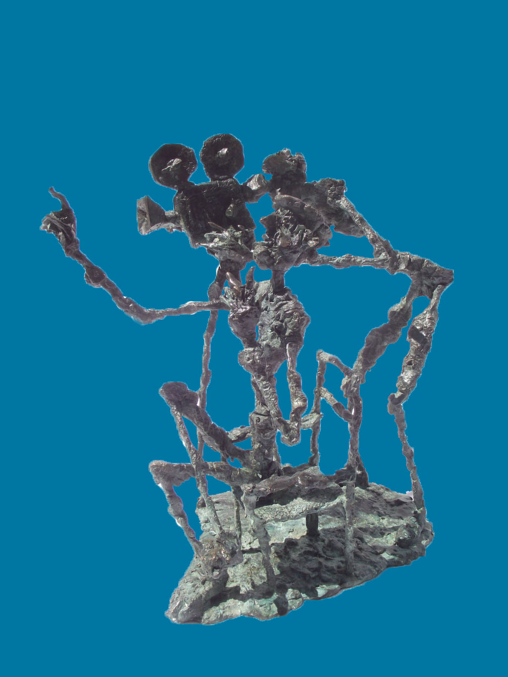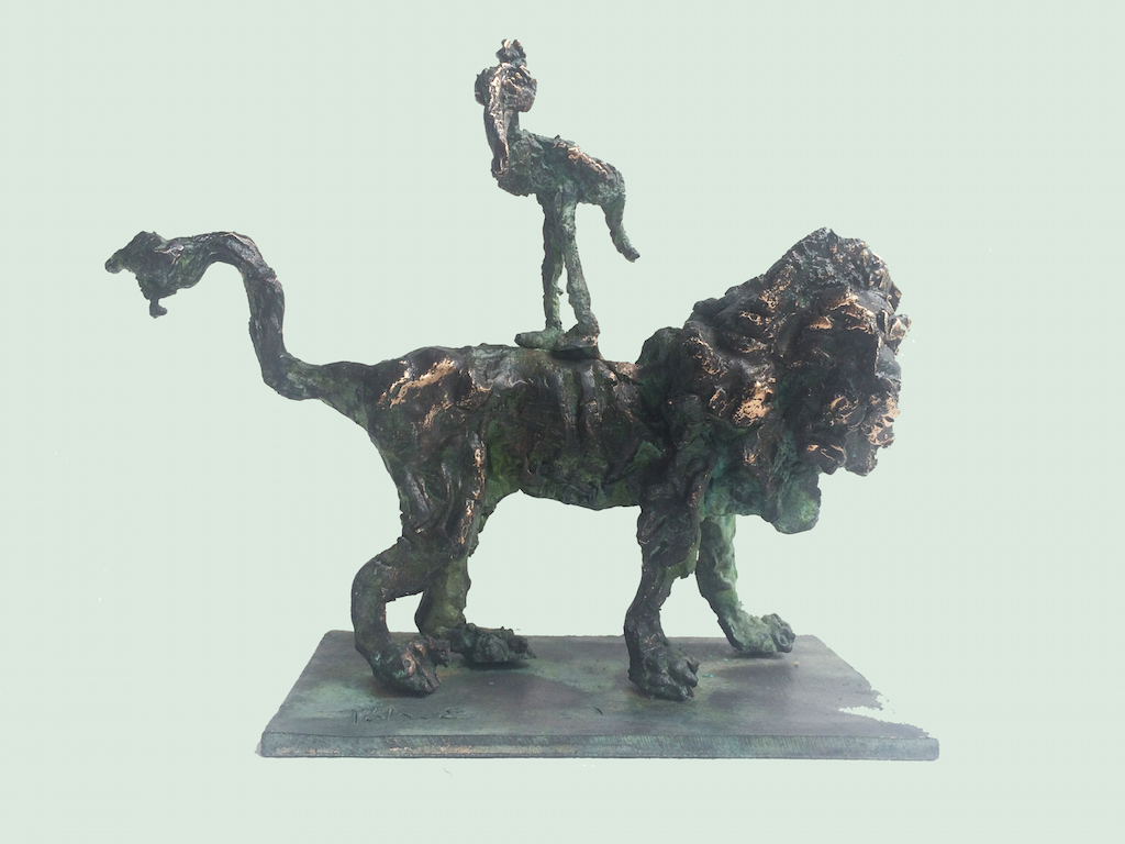 The caricature figures guard their seriousness and sublimity with fine simplicity. They are the players in the whirling fictive drama, which is brought to life by the bronze sculptures. The various, odd forms, devoid of all conformity, are rich and inventively shot through with contour effects, the scabrous surfaces inducing sculptures saturated with anxiety, tension and excitement.