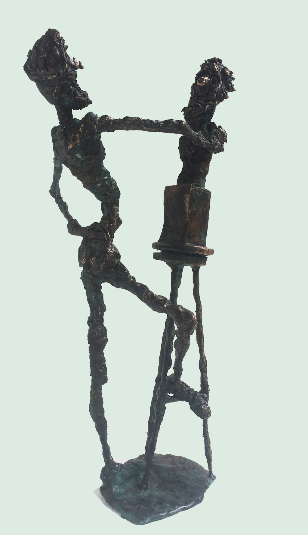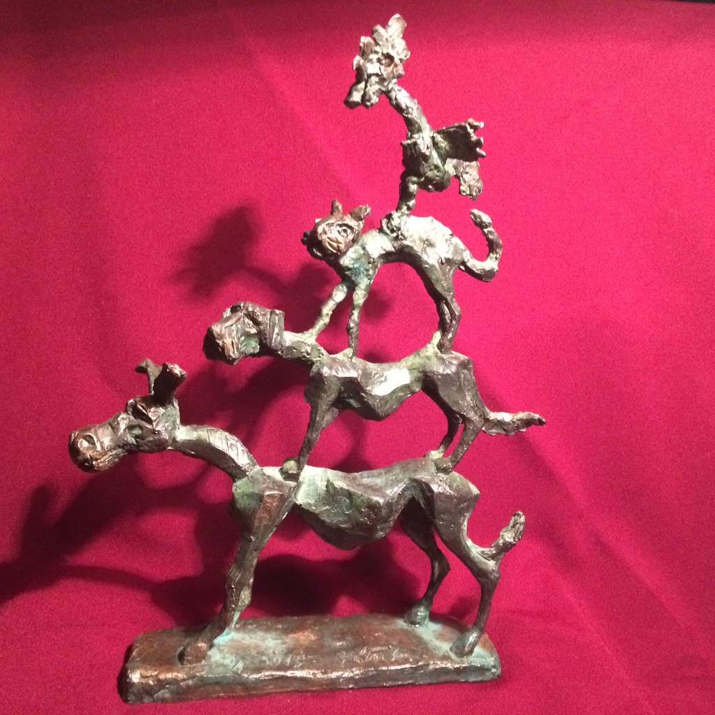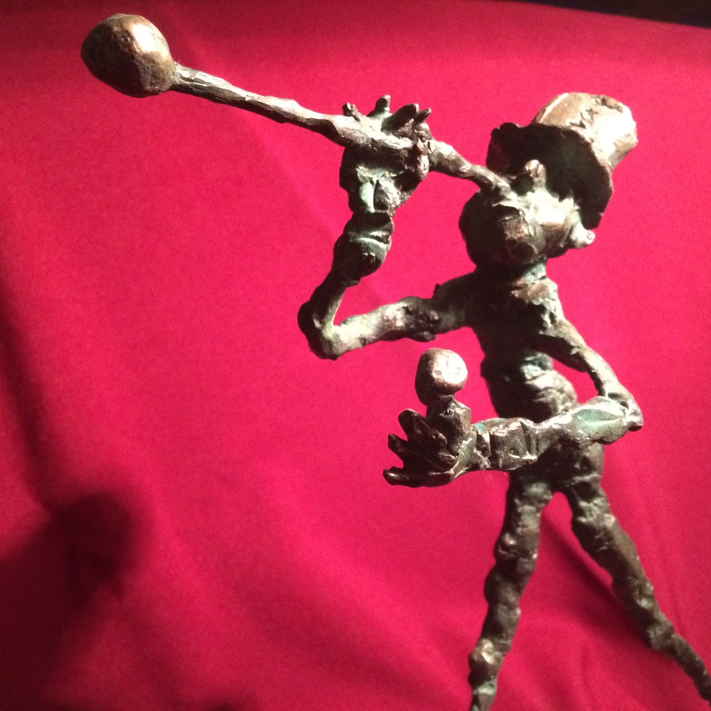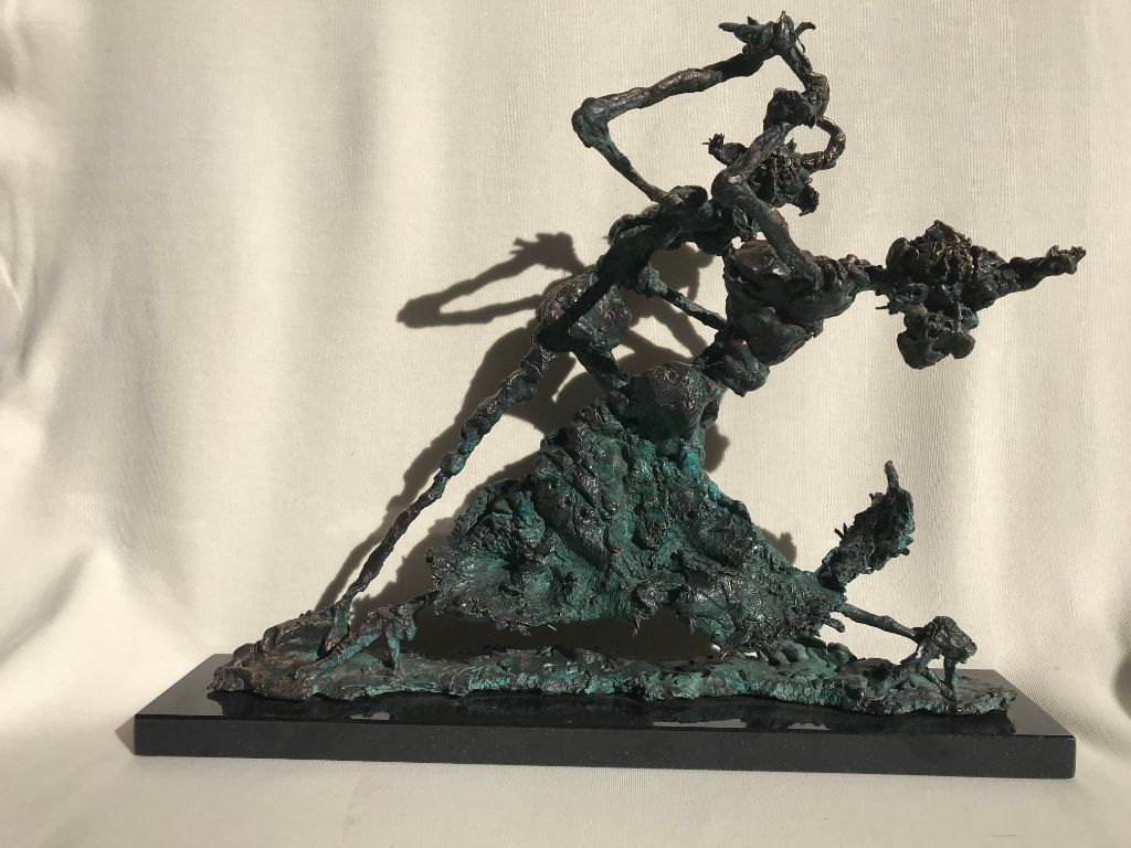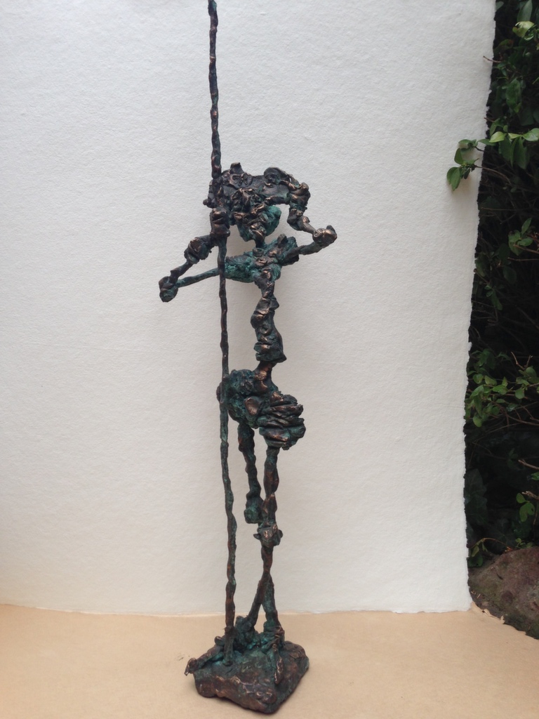 The undressed, lonely heroes of the brightly coloured paintings with whirling motifs return as one- or multi shaped, individual bronze works made with wax flowing technic. The thin stick-like figures create vertical stresses - we rarely see compositions on a horizontal axis such as Don Quijote. The formation of these figures shows us the wish to manifest such caricature-like expressions as: the deformed, elongated body parts, strange dimensions, enlarged and exaggerated features that the sculpture offers. These characteristics finally coalesce into a form that allows our receptive senses to enable us to derive from our objective position what these sculptures offer. The heroes of Ernő Tóth’s sculptures are clowns or clown-like figures. Casanovas - or fellows fancying themselves Casanova. Yet they are doubtlessly helpless against the world and even themselves, figures who are hesitating and clumsy but fanatically struggle on in their petty or large-scale affairs.
