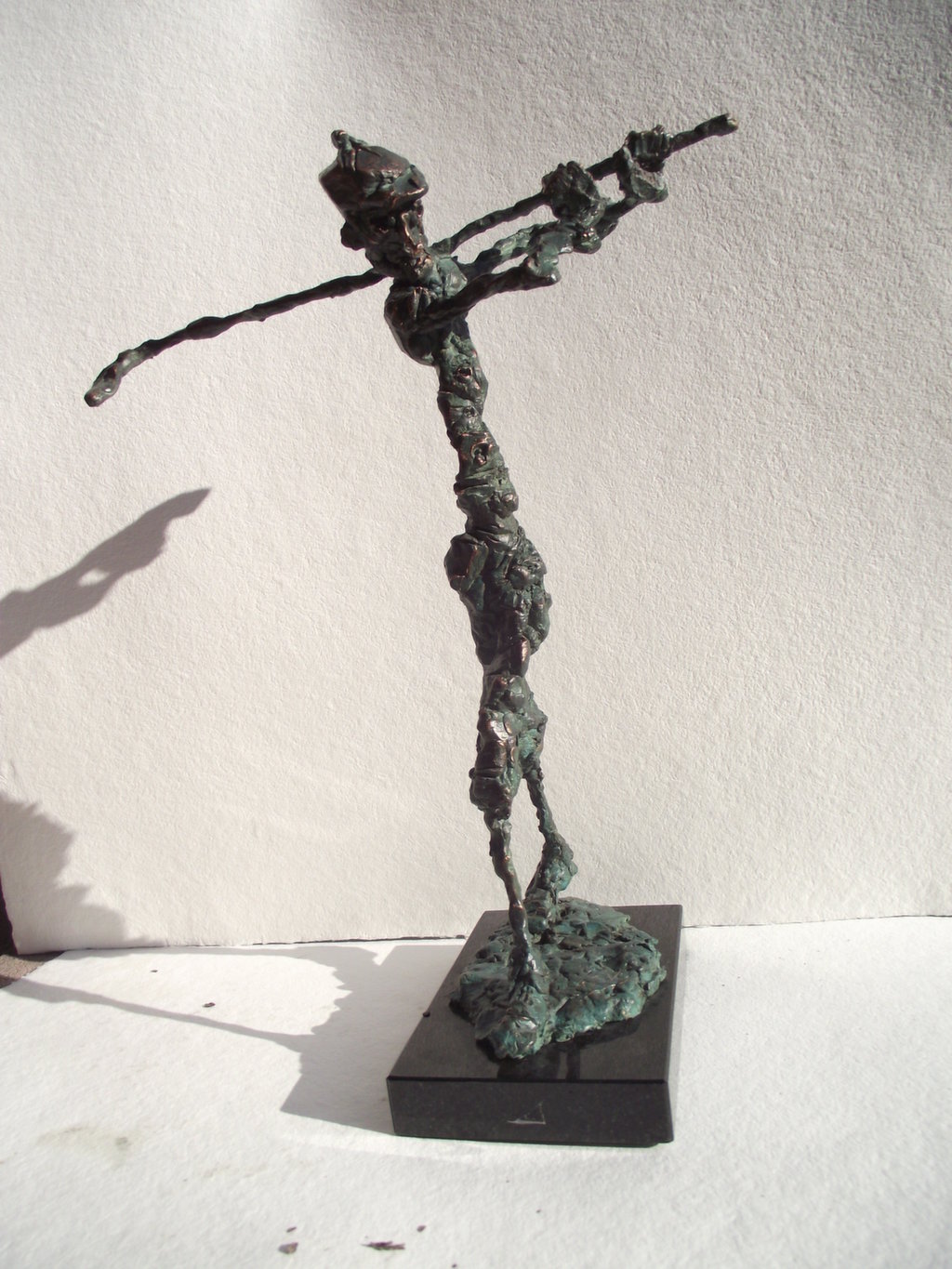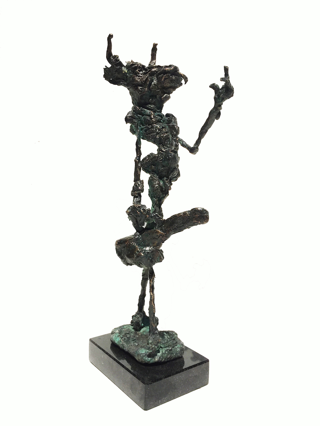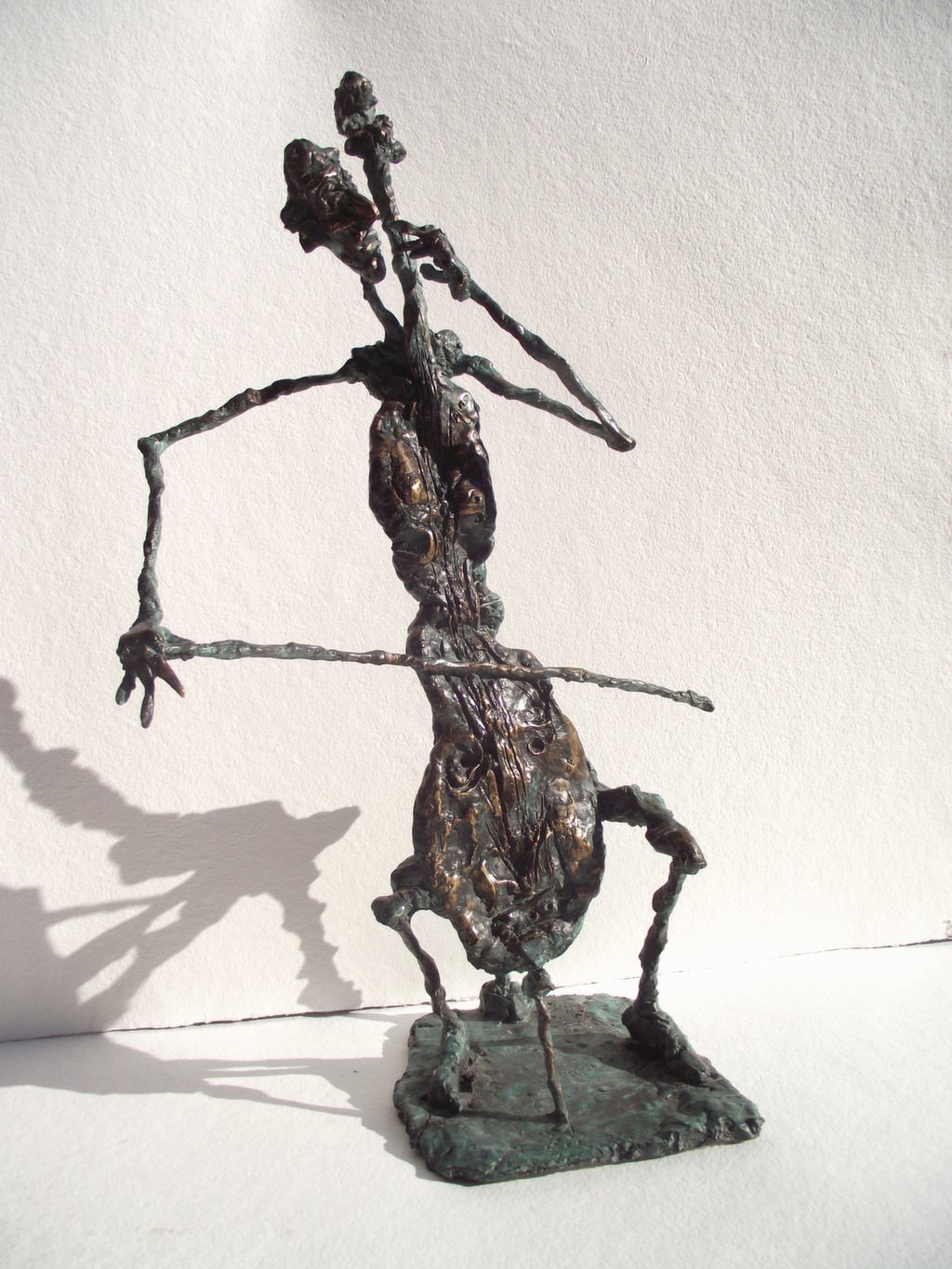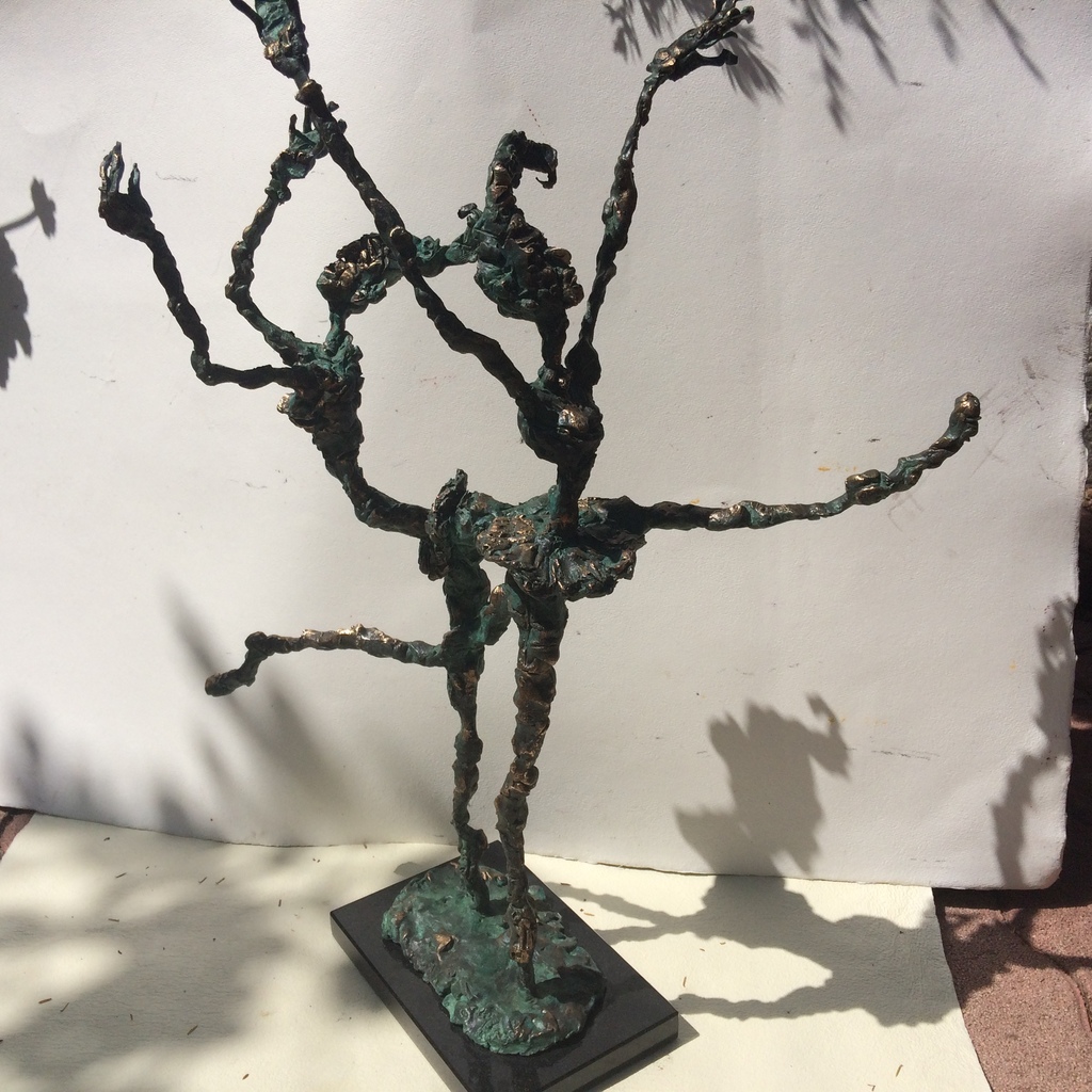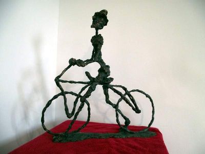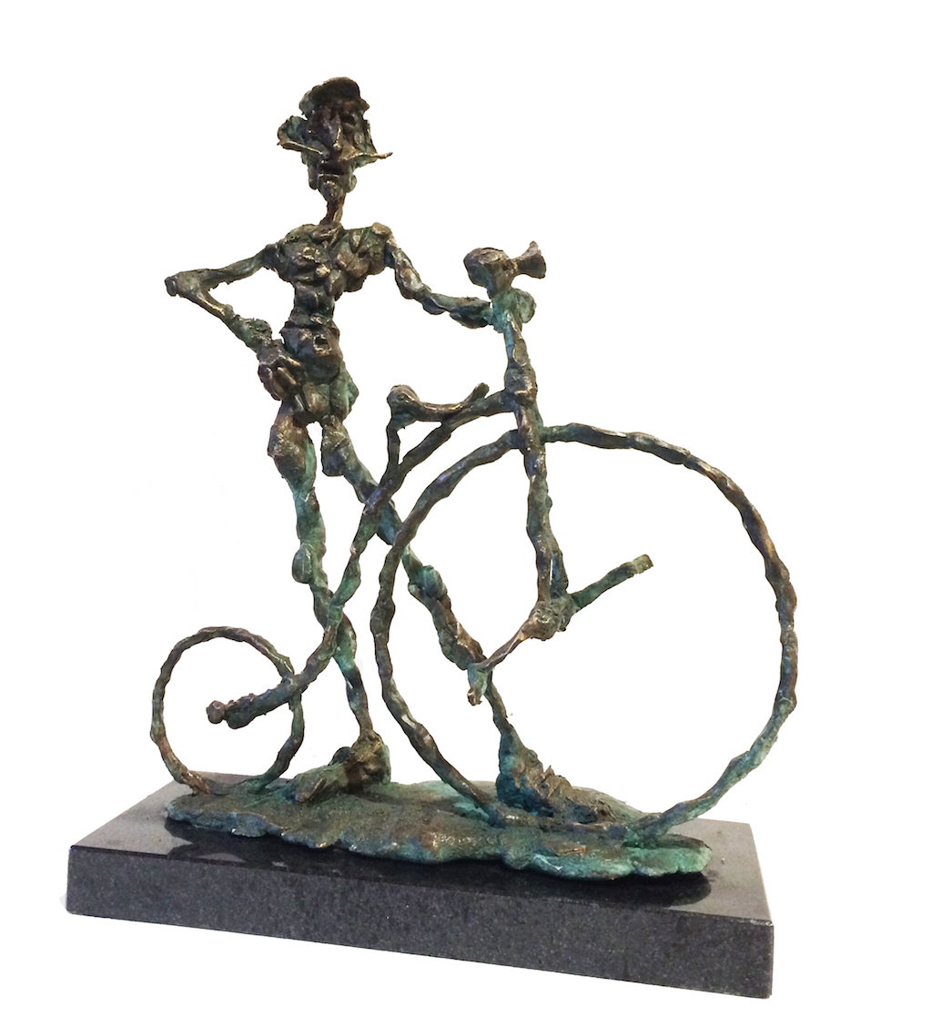 The undressed, lonely heroes of the brightly coloured paintings with whirling motifs return as one- or multi shaped, individual bronze works made with wax flowing technic. The thin stick-like figures create vertical stresses - we rarely see compositions on a horizontal axis such as Don Quijote. The formation of these figures shows us the wish to manifest such caricature-like expressions as: the deformed, elongated body parts, strange dimensions, enlarged and exaggerated features that the sculpture offers. These characteristics finally coalesce into a form that allows our receptive senses to enable us to derive from our objective position what these sculptures offer. The heroes of Ernő Tóth’s sculptures are clowns or clown-like figures. Casanovas - or fellows fancying themselves Casanova. Yet they are doubtlessly helpless against the world and even themselves, figures who are hesitating and clumsy but fanatically struggle on in their petty or large-scale affairs.