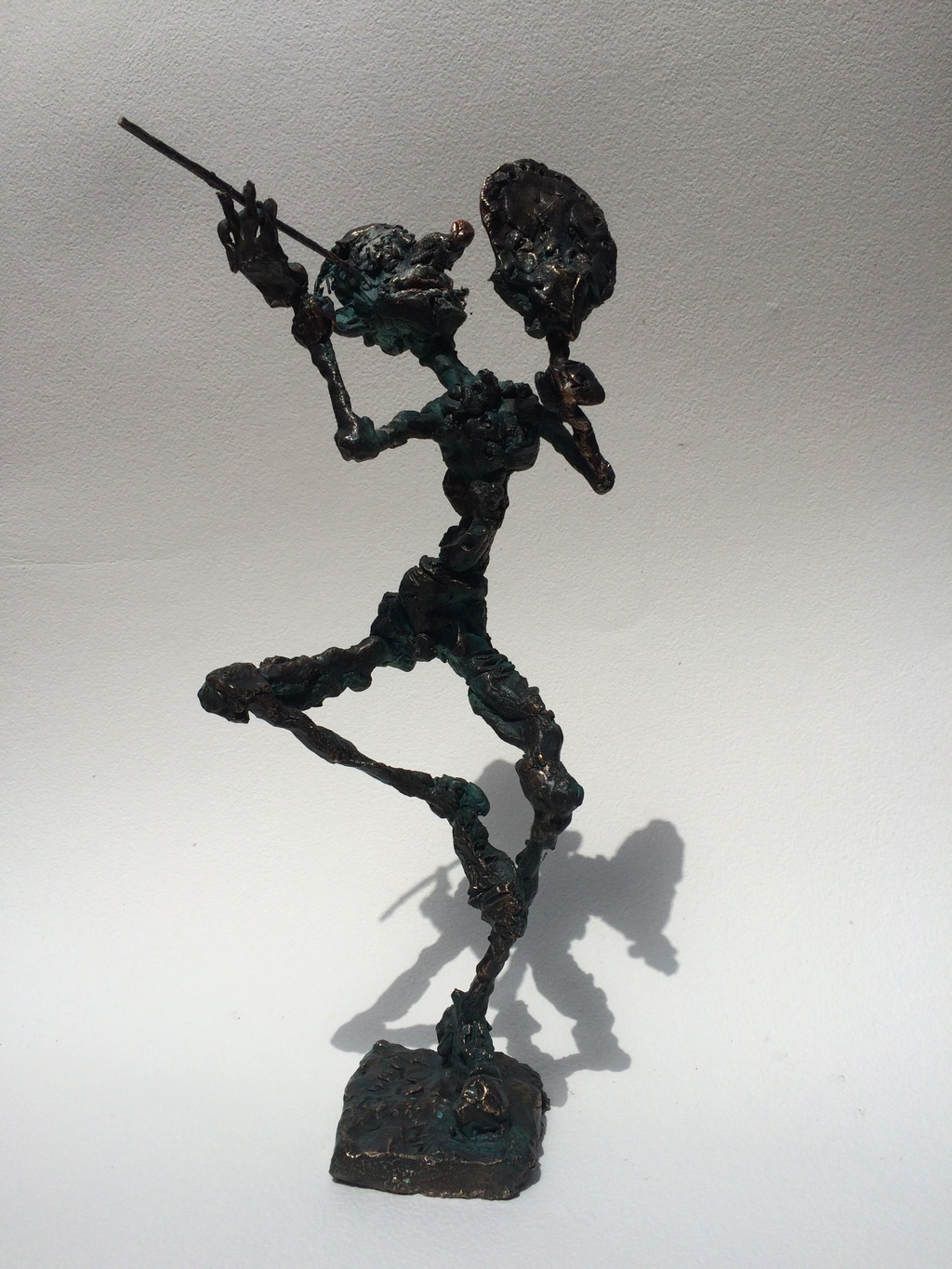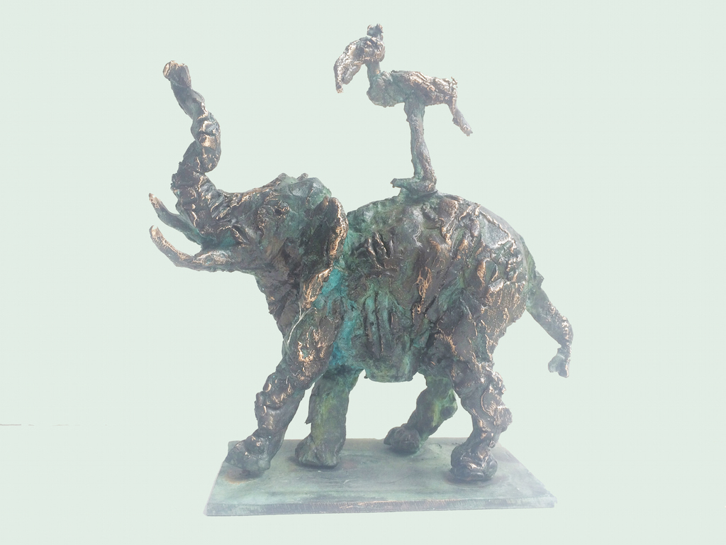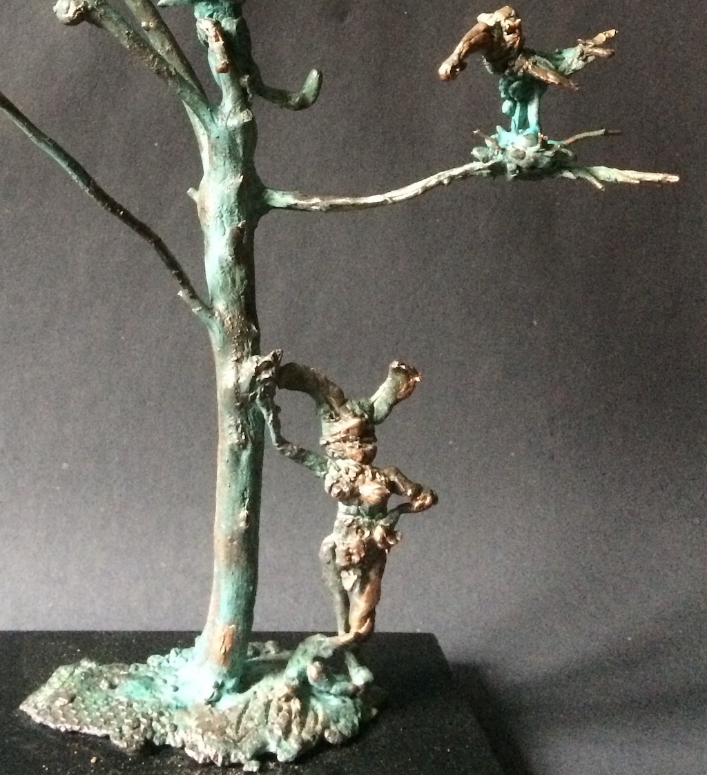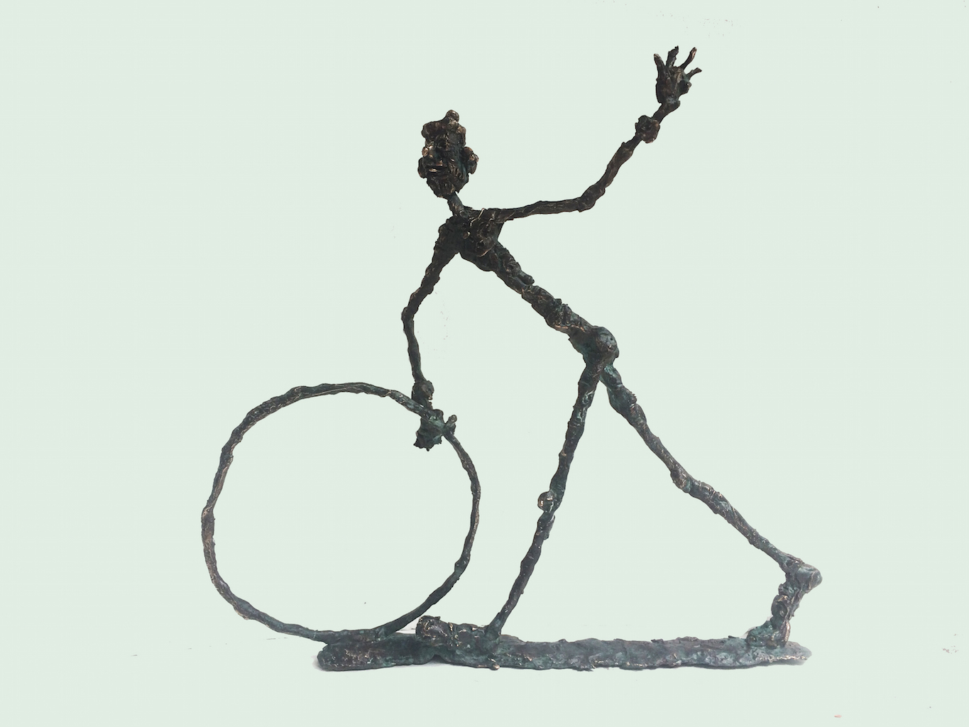 The undressed, lonely heroes of the brightly coloured paintings with whirling motifs return as one- or multi shaped, individual bronze works made with wax flowing technic. The thin stick-like figures create vertical stresses - we rarely see compositions on a horizontal axis such as Don Quijote. The formation of these figures shows us the wish to manifest such caricature-like expressions as: the deformed, elongated body parts, strange dimensions, enlarged and exaggerated features that the sculpture offers. These characteristics finally coalesce into a form that allows our receptive senses to enable us to derive from our objective position what these sculptures offer. The heroes of Ernő Tóth’s sculptures are clowns or clown-like figures. Casanovas - or fellows fancying themselves Casanova. Yet they are doubtlessly helpless against the world and even themselves, figures who are hesitating and clumsy but fanatically struggle on in their petty or large-scale affairs.