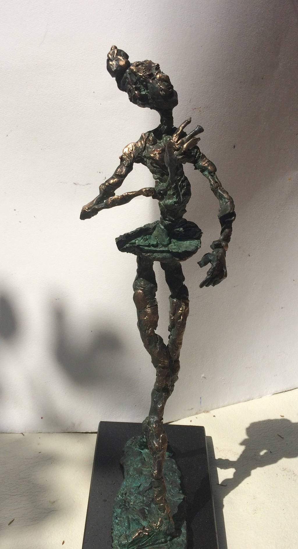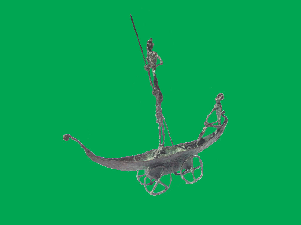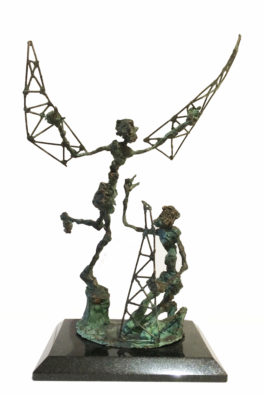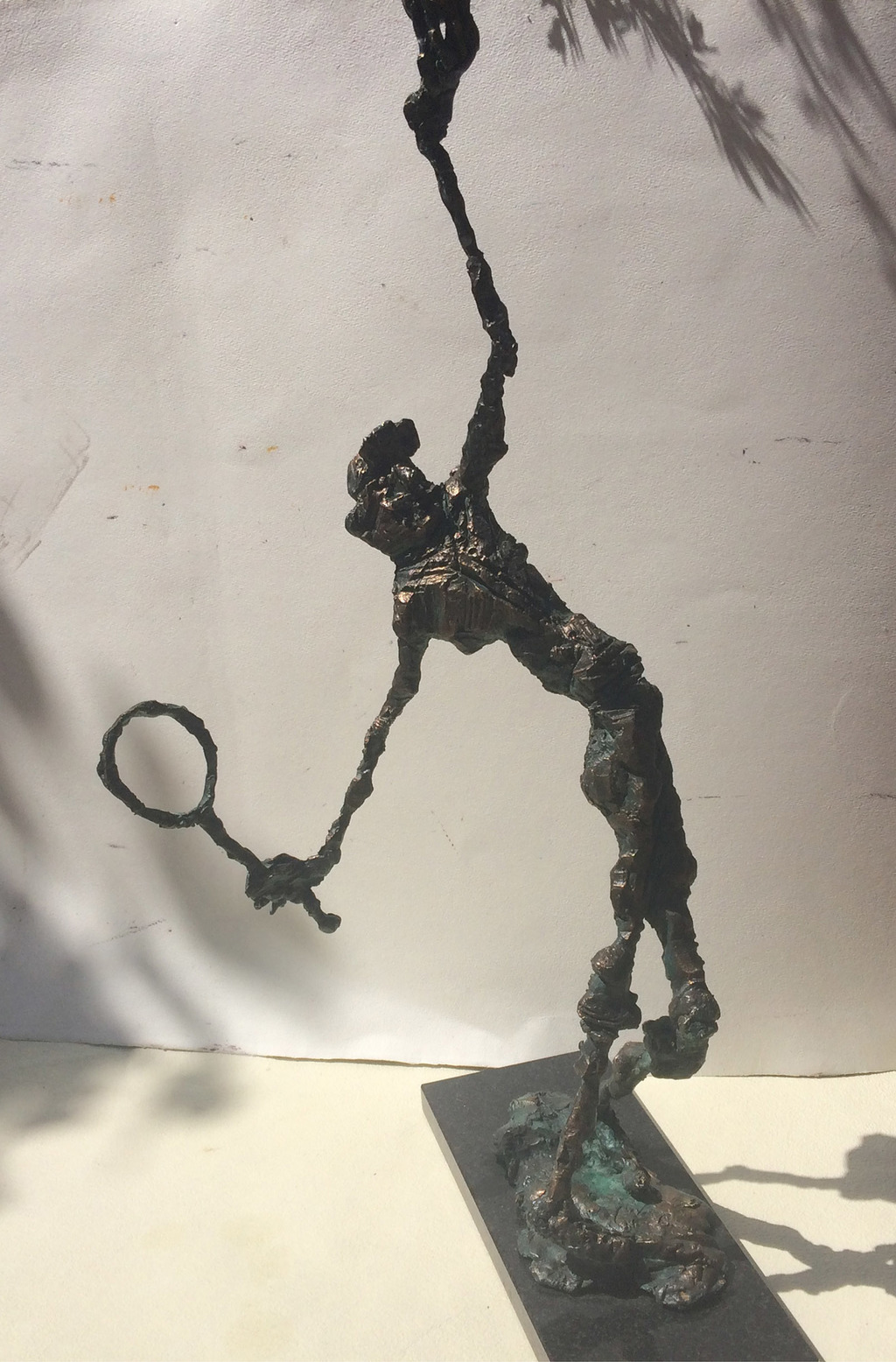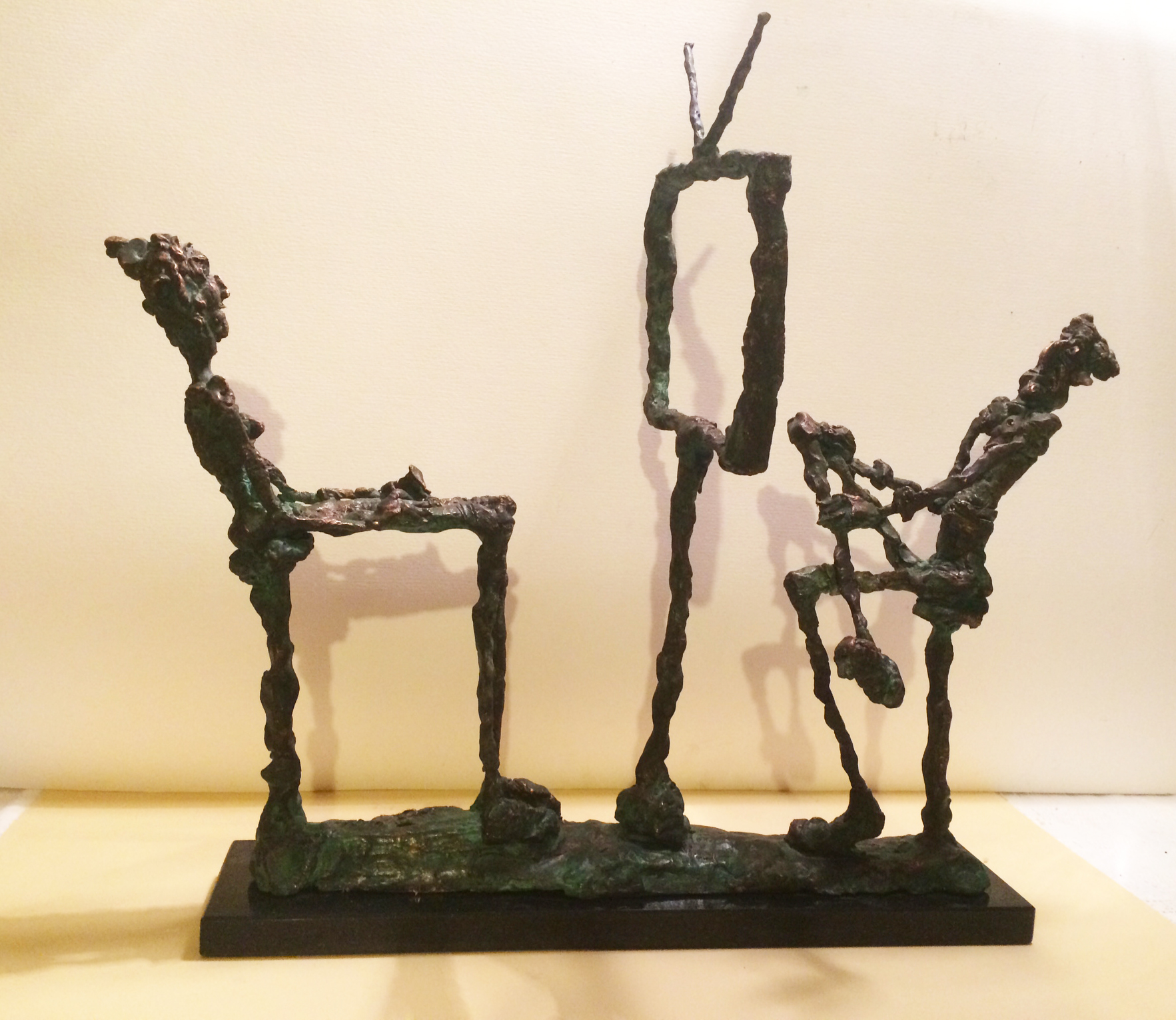 The undressed, lonely heroes of the brightly coloured paintings with whirling motifs return as one- or multi shaped, individual bronze works made with wax flowing technic. The thin stick-like figures create vertical stresses - we rarely see compositions on a horizontal axis such as Don Quijote. The formation of these figures shows us the wish to manifest such caricature-like expressions as: the deformed, elongated body parts, strange dimensions, enlarged and exaggerated features that the sculpture offers. These characteristics finally coalesce into a form that allows our receptive senses to enable us to derive from our objective position what these sculptures offer. The heroes of Ernő Tóth’s sculptures are clowns or clown-like figures. Casanovas - or fellows fancying themselves Casanova. Yet they are doubtlessly helpless against the world and even themselves, figures who are hesitating and clumsy but fanatically struggle on in their petty or large-scale affairs.